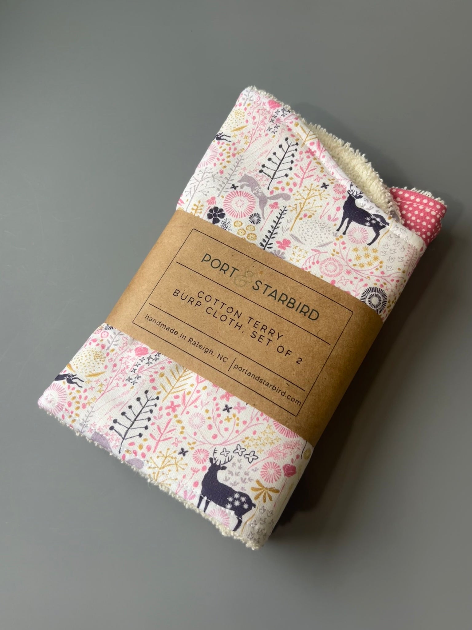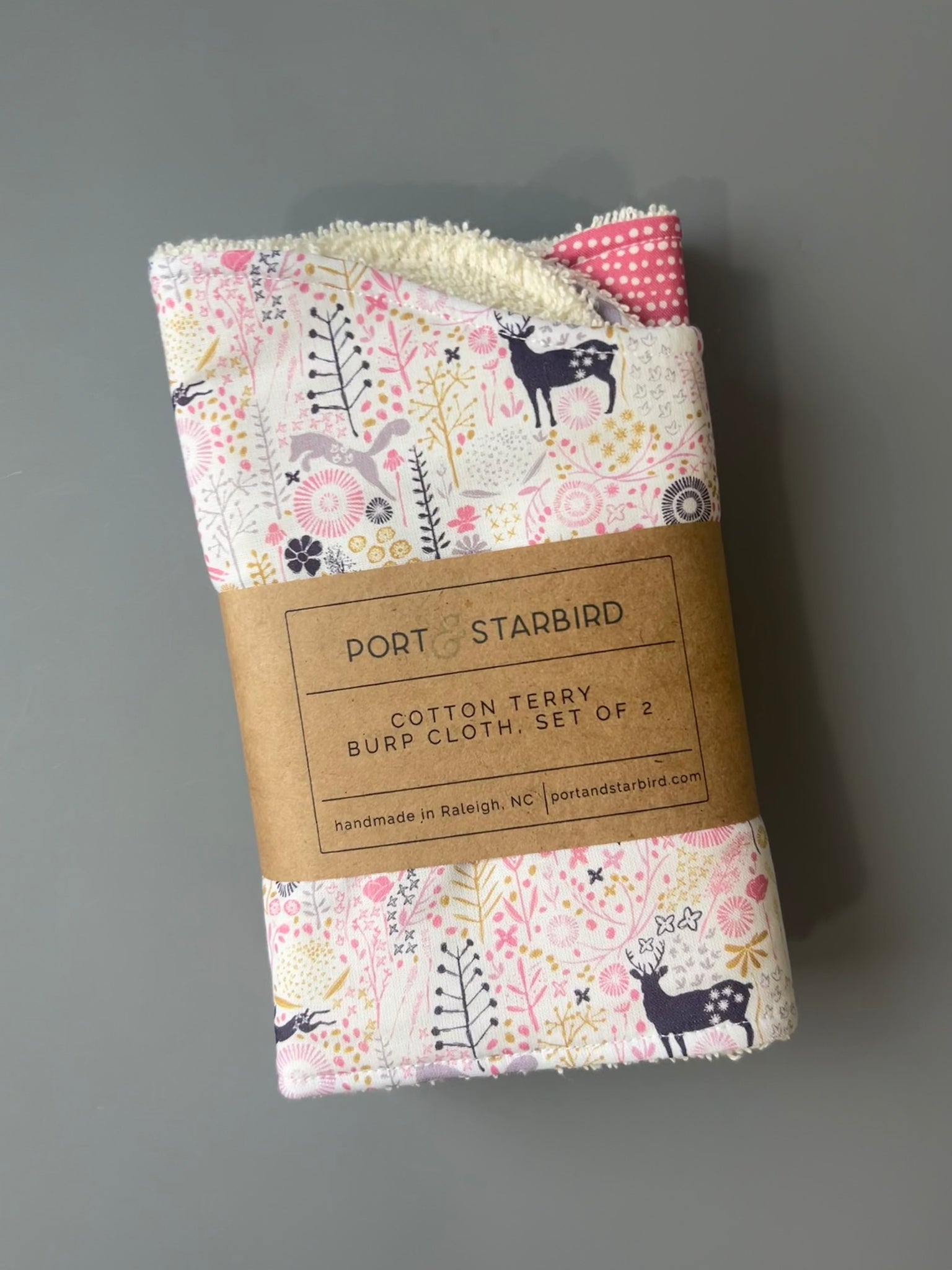 Our handmade cotton burp cloths are a must-have newborn essentials. These burp cloths perfectly absorb spit up and drool, keeping your cloths clean and dry. Our 3 layer, ultra absorbent burp cloths are made of a top layer of 100% quilter's cotton, middle layer of soft and natural batting and backed with cotton terry cloth.